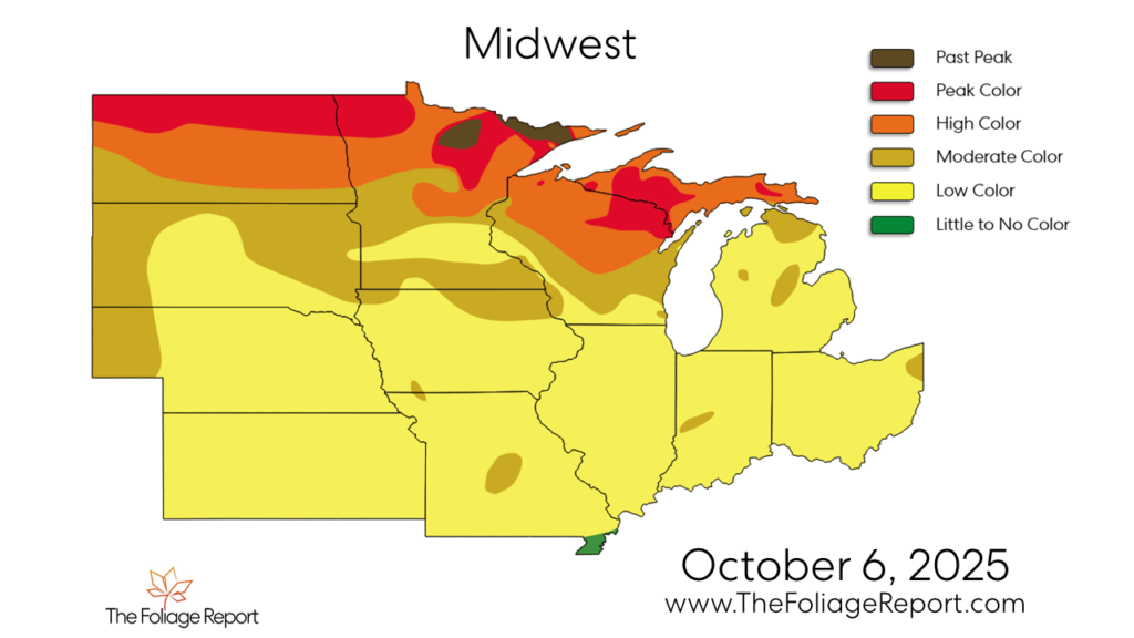 Heading out to the Midwest and Upper Plains, peak color is being observed along the Canada & US borders, some even past their peak color However, most of the region is still just starting to change, either at low to moderate coloration.