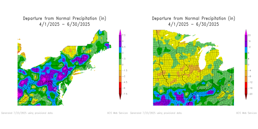 Starting with precipitation this past spring, the Northeast saw quite a bit of rainfall as a whole, with some areas seeing over 7" higher than normal for the season. This also extended southward into the Mid-Atlantic, with above average rainfall for much of the area. In the Midwest, the story is much different. While some areas (particularly the Ohio River valley, Missouri and Kentucky) saw normal or above normal precipitation during the spring season, many areas also saw below average precipitation.