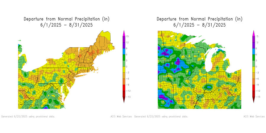 The story changes for the Northeast heading into the summer months, as precipitation became rather lacking from June to August. Generally, many places in the Northeast saw 3 - 6" below the average. Moving south into the Mid-Atlantic, rainfall was generally near to slightly below average, with places across West Virginia, Maryland, and Delaware being on the lower side. The Midwest had a mixed bag of above average and below average precipitation during the summer months, with Minnesota, Iowa, and Wisconsin tallying up the highest rainfall totals.