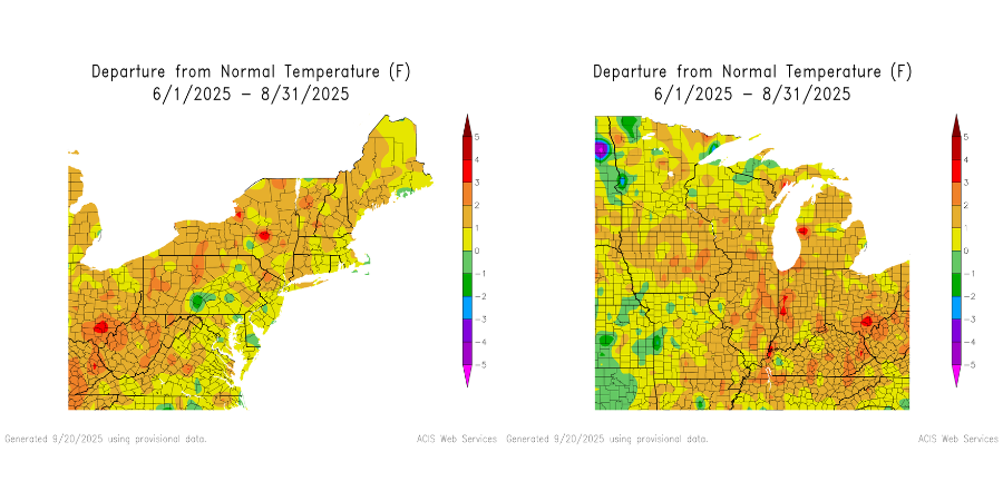 Temperatures, similarly, to last year, were above average across the board during the spring and summer months. Many areas averaged 1 - 2 degrees above normal for the summer time in the Northeast and Mid-Atlantic, while some locations in the Midwest pushed to 2 - 3 degrees above normal.