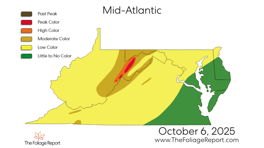 First up, we have to showcase the current state of Fall Foliage across parts of the US, thanks to maps from our friends over at The Foliage Report. Areas across the Northeast are already starting to see peak color, particularly over the higher terrain in Upstate NY and toward Canada. Further south and along the I-95 corridor, not so much color is being seen quite yet, but it is beginning. The same can be said in the Mid-Atlantic, with places seeing peak color across the elevations of the Appalachians.