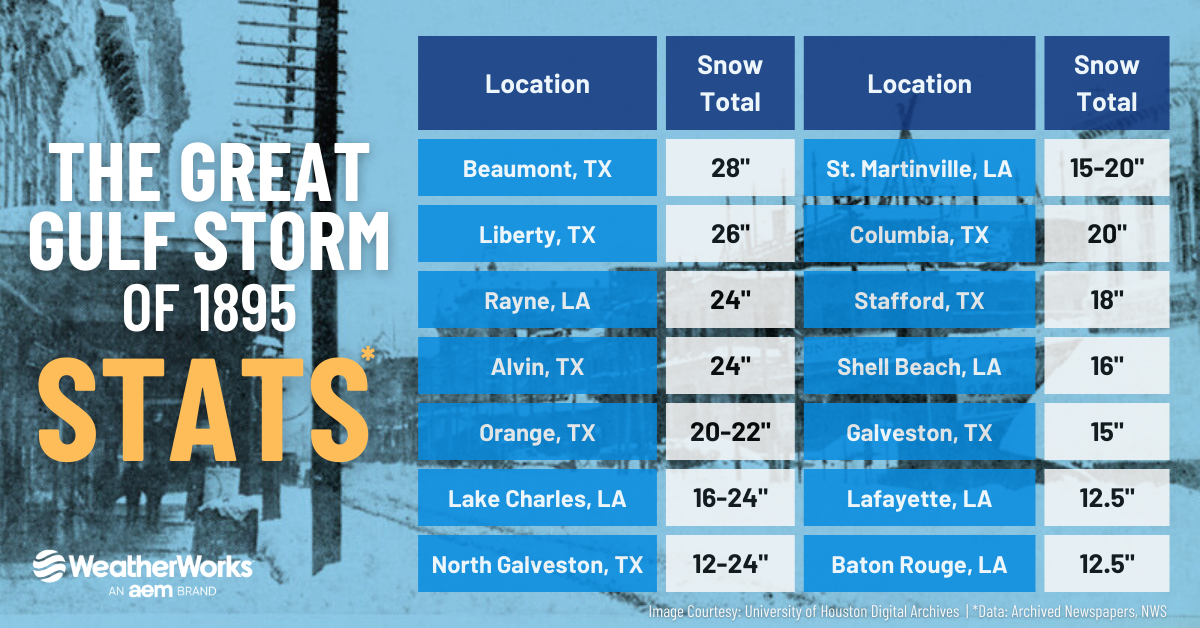 Other locations across southeast Texas were hit just as hard. Much of the region saw double‑digit accumulations, including a staggering 28 inches in Beaumont, around 15 inches in Galveston, and 12 inches in Victoria, to name just a few. Unprecedented amounts also occured in southern Louisiana as well. For instance, Lake Charles received anywhere from 16 to 24 inches, 12.5 inches in Baton Rouge, and New Orleans reported between 8–10 inches around the city. It should be noted that because these totals were taken over a century ago, most of these totals should be considered as close estimates, as it is hard to exactly verify them. Even so, none of these totals have been approached ever since (with the exception of New Orleans picking up as much as 11-12 inches from the 2025 January snowstorm).