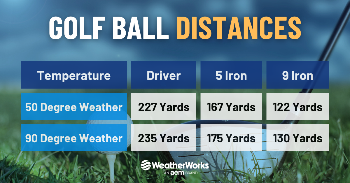 Now as for the golf ball itself, when its warmer, the rubber materials used to make the balls respond better. So, a warmer ball will come off the clubface with more velocity and spin than a colder ball. Plus, it will carry a bit farther because warm air is less dense. Golf ball selection also plays a part. If you are playing golf and the air temperature is below 50 degrees, a higher compression golf ball won't travel as far as a low compression ball. Pro tip, men, don't be afraid to use a woman's (lower compression) golf ball if you are playing when the air temperature is below 50 degrees.