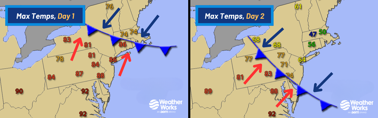 The images above and below show an example of a backdoor coldfront's progressioon over the northeastern US. On Day 1, the front advances into New England late in the day, bringing an increase in cloud cover and lower temperatures into the 60s and 70s. Winds are starting to turn out of the east-northeast, bringing a cooler, maritime airmass off the relatively cold Atlantic Ocean. By Day 2, the area is solidly in this airmass, and with low clouds or even sometimes drizzle present, high temperatures are struggling to reach past 50 degrees in Boston, which is 20t to 30 degrees colder than what occurred a day earlier when highs neared 80. During this particular example, Worcester, MA also set a record "low-maximum" on Day 2 when the high temperature only approached 47 degrees. After the frontal passage, temperatures fell more than 20 degrees in New York City from a high of 86 on Day 1 to only 64 on Day 2.