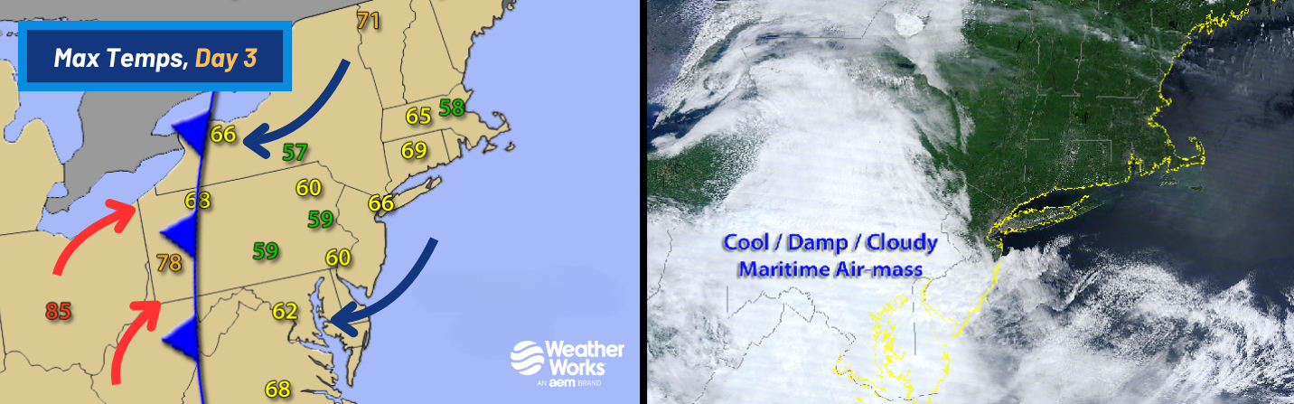 Sometimes, backdoor fronts if strong enough can progress very far. On Day 3 of this example, it did just that as it pushed west before stalling out along the Appalachian Mountains from Western New York to Western Virginia. Backdoor cold fronts are generally "shallow" in nature, with much of the colder, maritime air only extending a few thousand feet above the surface and therefore often having a very difficult time passing over the mountains. Day 3 saw some of the coolest temperatures and thickest cloud cover along and just to the east of the front. Most of New England actually dried out as high pressure built in from the northeast. Still, temperatures remained cool relative to Day 1 in New England. Between Days 2 and 3, high temperatures dropped from 83 to 59 degrees in Harrisburg, PA and from 88 down to 62 in Washington, DC.